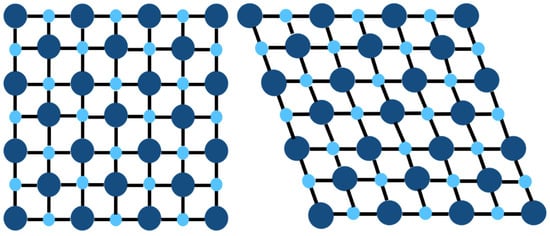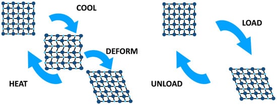 The transformation is a result of a slight shift in atomic position that changes the inter-atomic distance, leading to no sides of the crystal being the same length, and one angle being greater than 90° []. Martensite forms in multiple orientations with the same structure, and these are called variants; typically, two to four variants are formed side-by-side during transformation to accommodate the elastic strain around martensite, and this is known as self-accommodation []. When an austenitic NiTi alloy is cooled (see Figure 4), it forms martensitic twin variants. Because martensitic and austenitic crystals are of different crystalline shape and dimensions, martensite can only nucleate within the constraints of the austenitic phase by twinning. By twinning and forming martensite variants, the crystalline shape change can be accommodated, allowing for the formation of martensitic crystals without the accumulation of excessive strain energies []. The martensite structure formed has twin boundaries, which are free to move and are very low-energy. Under stress-induced martensite formation, transitional twinning happens at the martensite–austenite interface. This pattern of self-accommodation and transformation provides two unique properties to NiTi, namely thermal shape memory and superelasticity (also known as pseudoelasticity or mechanical shape memory) []. Of note, martensitic crystals formed during cooling or in response to stress are similar in shape. []