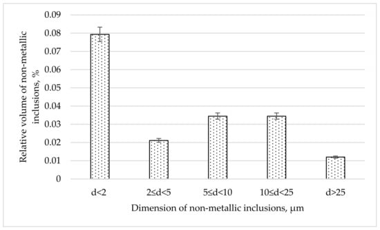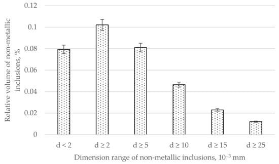 The relative volume of non-metallic inclusions as a dimension range function of the tested steel is shown in Figure 2.