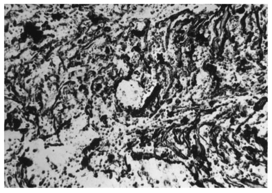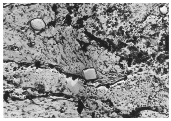 After the steel is tempered at 200 °C, the microstructure is composed of low-tempered martensite, so it is hard, with very low plasticity (the lowest among the tempering temperatures used). Based on the analysis of the literature [,,] and theoretical considerations of the formation and development of cracks in steels [,,], it can be assumed that this matrix may crack as a result of stresses with values higher than permissible or after exceeding the permissible number of cycles for fatigue life. Small-sized non-metallic inclusions of a compact shape (Al2O3, Cr2O3) have little effect on fatigue strength [,,,].