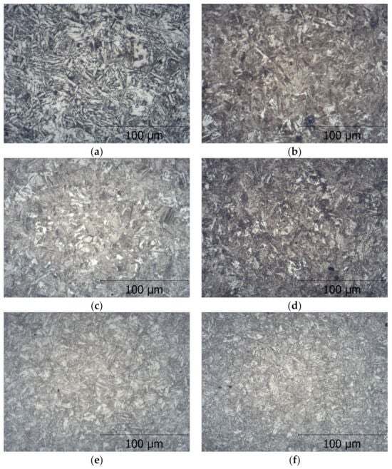 Microstructure of the researched steel when (a) hardened at 880 °C without tempered, (b) hardened at 880 °C and tempered at 200 °C, (c) hardened at 880 °C and tempered at 300 °C, (d) hardened at 880 °C and tempered at 400 °C, (e) hardened at 880 °C and tempered at 500 °C, and (f) hardened at 880 °C and tempered at 600 °C.