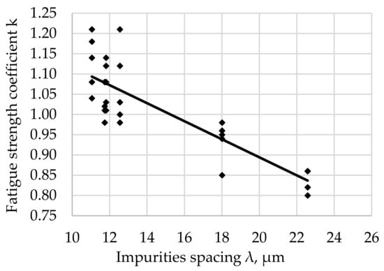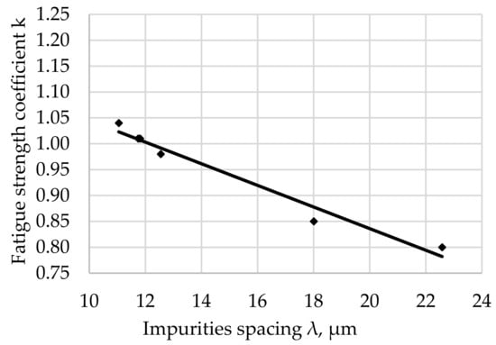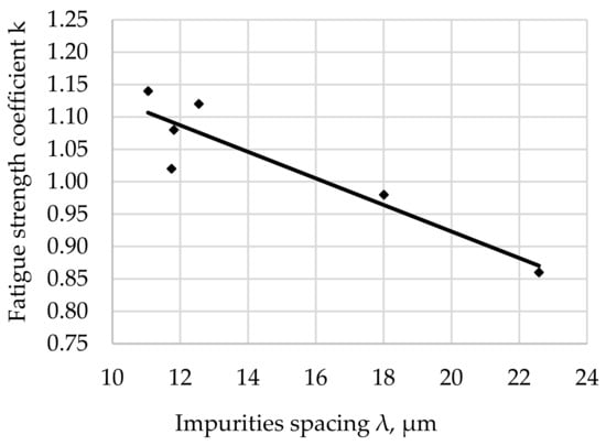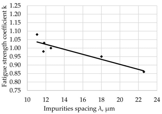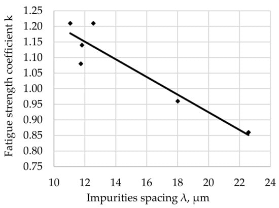 The relationship between the fatigue resistance coefficient and the impurities spacing λ of structural steel hardened at 880 °C and tempered at 600 °C is shown in Figure 11.