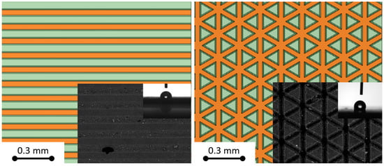 Comparison of studied pattern models with SEM images from Ref. [] of real texturized surfaces: linear (left) and triangular (right) pattern. In the images, orange denotes grooves created during laser processing, while green indicates protrusions that were not processed.