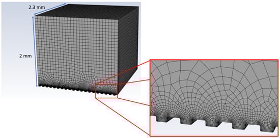 The simulation of a droplet freezing delay experiment was performed using a 3D simulation domain (2.3 mm length, 2.3 mm width and 2 mm height) of area above the material surface, which was generated in Ansys SpaceClaim (ANSYS 19.2, ANSYS Inc., Canonsburg, PA, USA). Micrometric grooves were translated over 20 times to introduce details of roughness generated with laser patterning. Meshing of the simulation domain was performed in an Ansys Design Modeler (ANSYS 19.2, ANSYS Inc., Canonsburg, PA, USA). The global mesh size was set to 75 µm, with 8 µm refinement inside the grooves, which was based on a mesh convergence study for the non-texturized model. This resulted in a total number of cells equal to around 700,000. An example of the meshed simulation domain is presented in Figure 2.