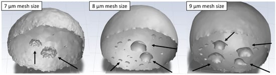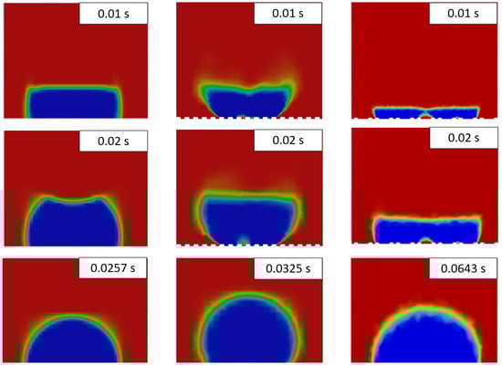 Due to the discrepancy in the observed results of freezing delay time increase due to texturization for the triangular pattern, additional models with different mesh refinement sizes (7 µm and 9 µm) were generated. This was especially interesting due to the observed mixed wetting state. The study revealed that the formation of bubbles underneath the droplet during the stabilization procedure is highly dependent on the mesh structure. Even for small changes in mesh refinement size, completely different bubble distributions were observed (see Figure 4). It may be caused by the so-called spurious currents, which are commonly found in VOF models with surface tension. The blurry nature of the interface in the VOF models leads to errors in the calculated curvature. The non-physical velocities near the interface are generated, which are dependent on mesh geometry []. The different bubble distributions changed the freezing delay time from 61 to 73 ms, depending on the configuration. Furthermore, the less emphasized increase in freezing delay time for the modeling case may be caused by a constant temperature boundary condition, which does not take into account the heat transfer through the material. In the case of water infiltrating the grooves during the stabilization, heat flux in following freezing simulation is more complicated due to the presence of perpendicular wetted facets in the pattern. Hence, this methodology should be improved to study more complicated wetting states.