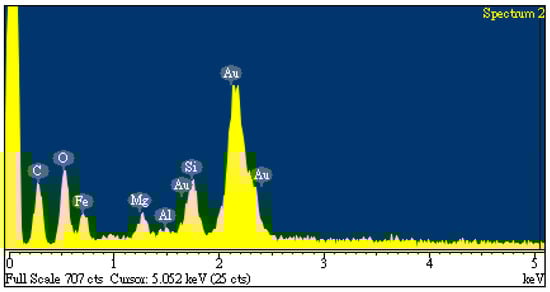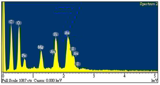 The SEM images (3000 magnification) of the dried oil-containing sludge (SL) and the optimal carbon product (i.e., C-05-SL-600-30-A) are shown in Figure 5. The former seemed to be only slightly porous and heterogeneous (Figure 5a) due to its small BET surface area (3.795 m2/g). In contrast, the carbon product (Figure 5b) indicated a porous texture on its surface, thus having a higher BET surface area. In addition, the elemental compositions on the surfaces of the carbon products (i.e., C-05-SL-600-30-A) can be seen in Figure 6. Here, the significant peak on the far right is the background gold (Au) used to provide a conductive film on the surface. The contents of carbon, oxygen, silicon, magnesium, and iron were 24.2, 15.8, 5.0, 2.3, and 52.6 wt%, respectively. These results are consistent with a previous study [10].