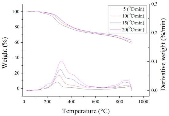 Figure 2 depicts the results of the thermogravimetric analysis (TGA) and derivative thermogravimetry (DTG) measurements for the dried oil-containing sludge in the temperature range of 25 °C to 900 °C at four heating rates (5, 10, 15 and 20 °C/min) under an inert nitrogen atmosphere. These curves were normalized by the initial sample mass. Obviously, a significant weight loss of about 25–30% was observed in the temperature range of 200 °C to 500 °C. This can be attributed to the evaporation loss of residual heavy oil fractions still contained in the dried sludge.