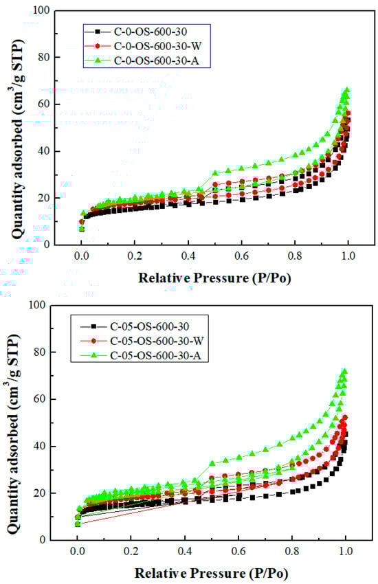 - The pore properties of carbon products can be enhanced by post-washing with water and dilute acid solution; that is, the following specific surface areas were obtained: 50.799 and 49.462 m2/g (C-0-SL-600-30 and C-05-SL-600-30, respectively), 58.980 and 57.832 m2/g (C-0-SL-600-30-W and C-05-SL-600-30-W, respectively), and 63.132 and 69.132 m2/g (C-0-SL-600-30-A and C-05-SL-600-30-A, respectively). On the other hand, acid-washing resulted in better pore properties than those obtained by water-washing, possibly due to more dissolution (leaching-off) of inorganic minerals and more pores being developed and formed [30,31,34].