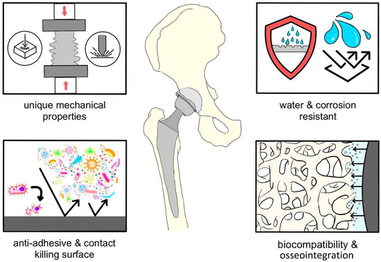 In the context of implant integration into bone, new and improved methods of functionalizing implant surfaces by modifying chemical and mechanical properties are being explored. It has been suggested that biomimetic surfaces increase cell interactions in the biological environment, ultimately improving the effectiveness of the implant [62]. It is worth bearing in mind that the introduction of synthetic materials into the body may trigger inflammatory reactions, limiting device integration. For this reason, protective coatings are proposed to control foreign body reactions, maintain long-term mechanical stability, and prevent adverse reactions [63]. One common adverse reaction after joint replacement surgery is the release of cobalt and chromium ions into the bloodstream on metal-to-metal surfaces, posing a potential health risk [64,65]. Ceramic surfaces have been suggested as a solution, although this requires advanced design due to the thickness of the implant. Clinical practice increasingly emphasizes the need for arthroplastic implants to meet a set of critical properties to ensure efficacy and patient safety (Figure 2). The introduction of new solutions requires a balanced approach, considering both benefits and potential risks, to effectively contribute to advances in orthopedic surgery [60].
