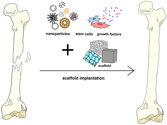 Schematic representation of optimal scaffolds for bone tissue regeneration containing nanoparticles, stem cells, and growth factors. Adapted from Bauso et al., 2023 [67].