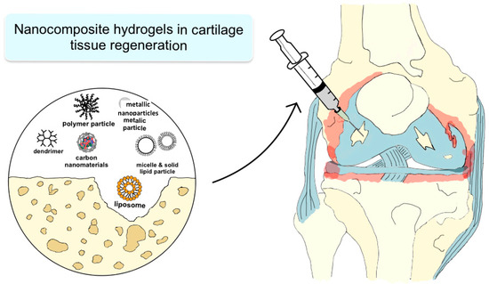 Schematic representation of cartilage tissue regeneration by injections with hydrocolloids containing a variety of nanocomposites. Adapted from Lagneau et al., 2023 [159].