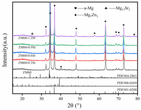 Figure 2 shows the XRD pattern of the rolled ZM60-xSr alloy. The XRD analysis shows that the phase of the rolled ZM60 alloy is mainly composed of an α-Mg phase and a Mg7Zn3 phase. After the addition of Sr, the diffraction peak of Mg7Zn3 was significantly weakened, and a new diffraction peak of Mg17Sr2 appeared. The peak intensity of the Mg17Sr2 phase became higher and higher with the increase in Sr content.