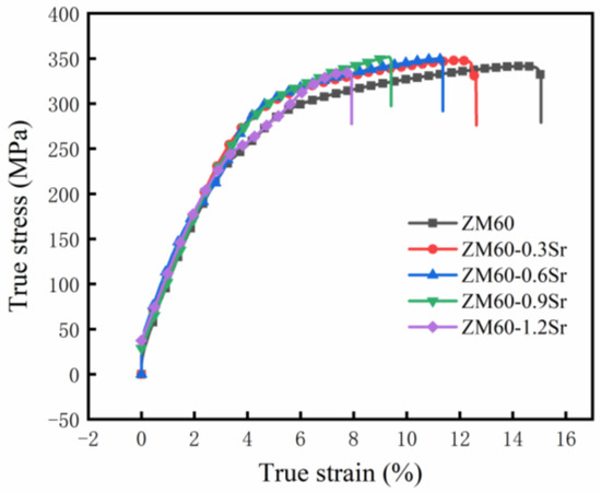 True stress–strain curves of rolled ZM60-xSr alloy.