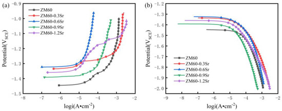 The anodic (a) and cathodic (b) polarization curves of rolled ZM60-xSr alloy in Hank’s solution.