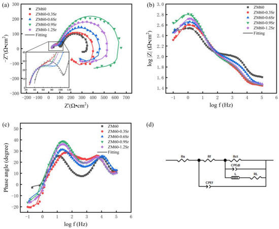 EIS of rolled ZM60-xSr alloy in Hank’s solution: (a) Nyquist plots; (b) Bode plots of |Z|-frequency; (c) Bode plots of phase angle frequency; (d) fitted equivalent circuits.