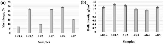 Characterisations of the samples: (a) shrinkage and (b) bulk density.