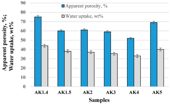Figure 11 shows the apparent porosity and water uptake. Apparent porosity of the undoped samples decreased from 75 ± 1% to 60 ± 1%, with the sintering temperature increasing from 1400 °C to 1500 °C due to densification. The apparent porosity of doped samples with microsize TiO2 decreased from 60 ± 1% to 52 ± 1%, due to the increasing quantity of TiO2, and the sintering temperature increase. In the case of samples (AK5), nanosize TiO2 porosity is 69 ± 1%. The use of 1 pbw of 20 nm TiO2 increases the porosity of samples in comparison with samples with 1 pbw of microsize TiO2.