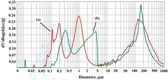 Pore size distributions of the samples: (a) AK1.4 sample, (b) AK1.5 sample.