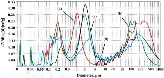 Pore size distributions of the samples: (a) AK2 sample, (b) AK3 sample, (c) AK4 sample, and (d) AK5 sample.