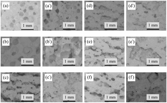 TableTop SEM micrographs illustrating the macrostructure of the samples, magnification ×50: (a–f) view of pores in the zx-plane; (a’–f’) view of pores in xy-plane; (a,a’) AK1.4 sample, (b,b’) AK 1.5 sample, (c,c’) AK2 sample, (d,d’) AK3 sample, (e,e’) AK4 sample, and (f,f’) AK5 sample.