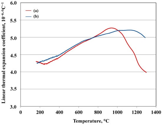 Temperature dependence of the linear thermal expansion coefficient for sintered samples: (a) of the undoped sample sintered at the 1500 °C; (b) of the sample with 1 pbw of nanosize TiO2.