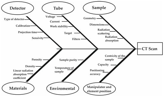 Research into improving the accuracy and suitability of CT for use in various technical fields has been ongoing for many years. As Figure 1 shows, there are many distortions and elements that affect the application of the CT for subsequent tasks [17]. The first problem, which is still not fully resolved and divides the user and manufacturer community, is the calibration and sometimes the adjustment of these devices. Manufacturers have developed standards that adjust the machine within a small range of the measurement space, which users disagree with, repeatedly proving that the position of the measuring element in different parts of the space is crucial. This is at least related to the resolution of the system [18,19]. Another important aspect on which research was conducted was the analysis of the impact of algorithms for assembling 2D images into a 3D object. In medical research, it has been found that a reconstructive iterative algorithm improves qualitative analysis, as the amount of noise increases with decreasing thickness and at cross-sections [20].