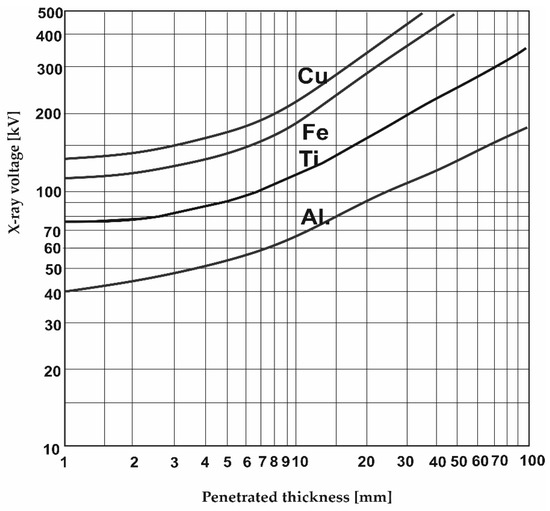 As presented above, CT used for industrial measurements is still not fully recognized. When working with CT, a major problem is the selection of scanning parameters [32,33]. There are some input data upon which to base the type of plot of the maximum voltage set on the X-ray tube against the thickness of several basic materials like Cu, Fe, Ti, or Al (Figure 2).