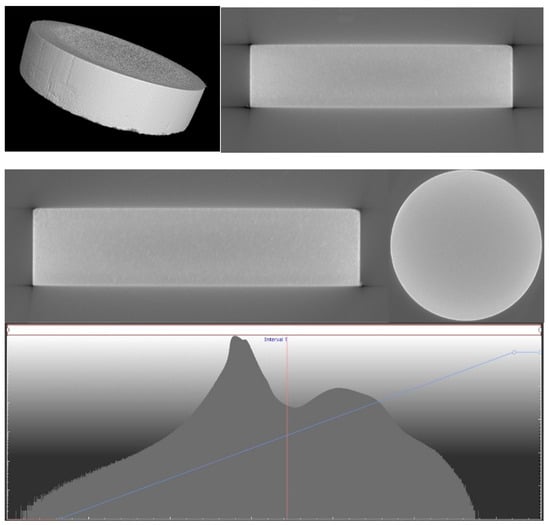 Cylindrical samples of the tested materials were prepared on a TOP-300 universal lathe. Density tests were performed on a Pycnomatic ATC helium pycnometer from Thermo Scientific (Waltham, MA, USA) according to the ASTM D792 [35], ISO 1183 standard [36]. One of three measuring containers with a volume of 40 was used, with a measurement temperature of 25 °C and a gas pressure stability of 0.001 kPa. A calibration method using certified stainless steel balls was performed. Repeatability and accuracy modes at the level of 0.01% were maintained. Density measurement accuracy was 0.001 . Helium 6.0 was used for the tests. Due to the quality of CT scans, the histogram was set in the range of 200–10,000.