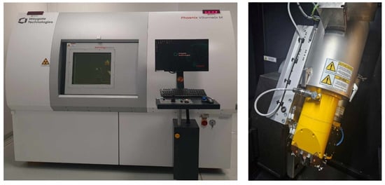 The tests were performed on a Waygate Technologies Phoenix V|tome|x M Metrology Edition CT scanner (Cincinnati, OH, USA) with an accuracy of (3.8 + L/100 [mm]) , using a Microtube X-ray tube with a maximum power of 240 W with a measurement resolution of less than 1 . In addition, a Nanotube X-ray tube with a measurement resolution of 0.2 was installed in an industrial CT scanner located at the Coordinate Metrology Laboratory of the Faculty of Mechanical Engineering at the Cracow University of Technology. The 3D scanning measurement space was mm.
