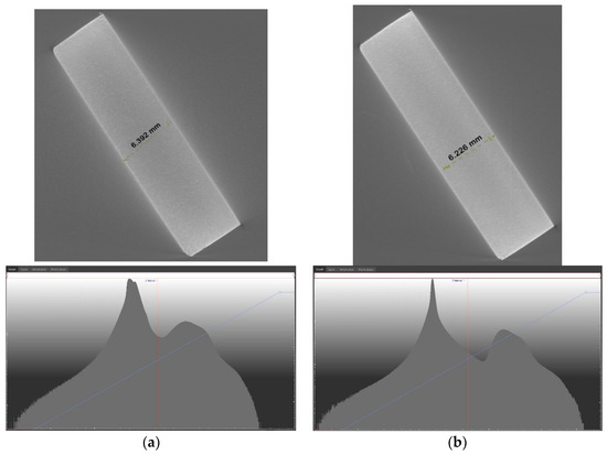 Figure 5a shows ring artifacts that were created during scanning. This is caused by improper tomography operating parameters, which caused the histogram not to be in the range of 200–10,000. On the other hand, in Figure 5b there are no ring artifacts because the scanning parameters were properly selected, and the histogram was in the range of 200–10,000. Results are from the selected sample—11. In the case of the scan from Figure 5a, the distance between the upper and lower planes was 6.392 mm, and, in the case of the sample from Figure 5b, the distance between the lower and upper planes was 6.226 mm. The height, as determined on the Zeiss Eclipse coordinate measuring machine, was 6.192 mm (Figure 6).