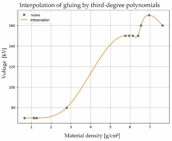 In this study, the influence of material densities on the selection of appropriate lamp parameters for CT measurement can be observed. A minimum voltage selection curve was determined for given material densities. The results ranged from 70 to 160 kV for densities from 0.661 to 7.632 . The maximum voltage remained at one level, i.e., 190 kV. In order to make the results complete, interpolations (1d with third-degree polynomials) were used to feed into the matrix for the selection of setting parameters from the material density, by determining the third-degree glued functions (cubic spline). Fifty tension values were generated, averaging every 0.200 (Table 3 and Figure 8).