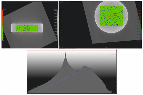 Each sample was placed in the CT space at the exact distance at which the manufacturer recommends performing the adjustment. This is very important, as the resolution of the measurement depends on the distance of the measuring element from the X-ray tube. Voltage adjustments, both minimum and maximum, were selected for each part. In this task, it should be noted that the device will indicate if the parameters are too high, providing a warning alarm about the possibility of damage to the device. The lower limit, on the other hand, is determined by checking the histogram readings and selecting them according to the manufacturer’s assumptions and based on the laws of physics.