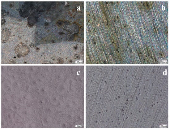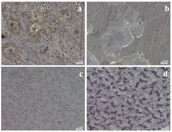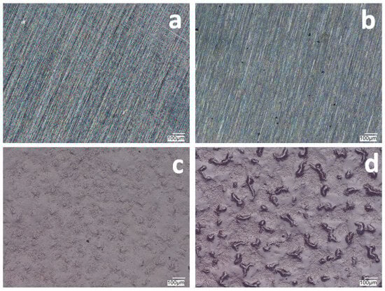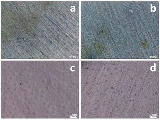 The surface of VTMS/PEDOT/PMo12 coatings deposited on 41Cr4 steel with VTMS concentration of 3.16 mol dm−3 and EDOT/PMo12 powder content: 0.1 g (a), 0.15 g (b), 0.25 g (c), and 0.35 g (d). KEYENCE VHX-7000 digital microscope, Magn. 200.