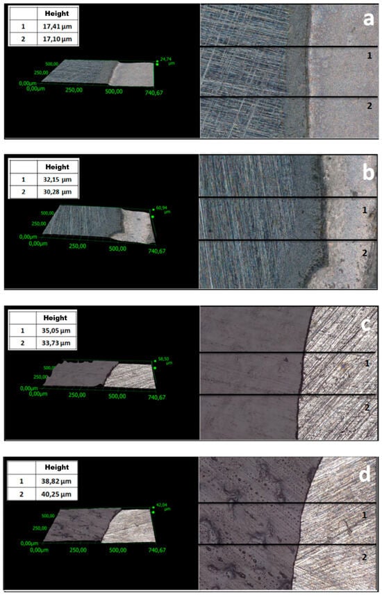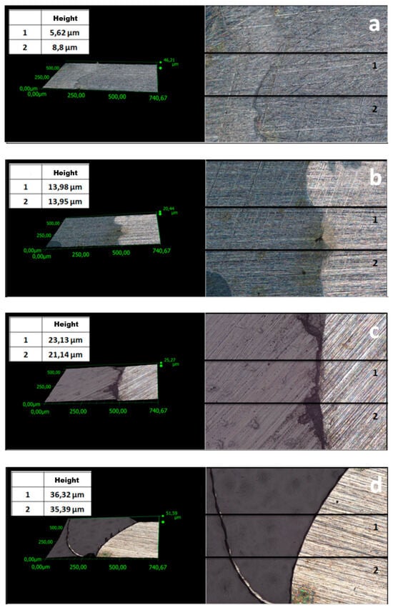 One of the key parameters affecting the corrosion resistance of steel components is the thickness of protective coatings. In this study, this parameter was analyzed using two methods. Profiles were examined (Figure 3 and Figure 4) to evaluate the thickness of the coatings. The average thickness of VTMS/PEDOT/PMo12 coatings with variable EDOT/PMo12 powder content (measured at 2 locations on the specimen) is presented in Table 2. The recorded thickness was measured using a KEYENCE digital microscope for different EDOT/PMo12 powder content: 0.1 g (a), 0.15 g (b), 0.25 g (c), and 0.35 g (d).
