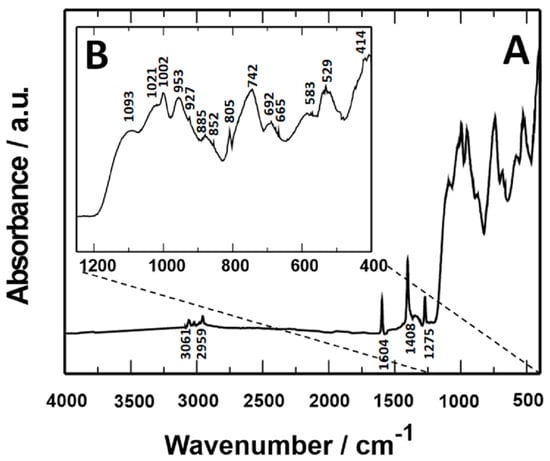 FTIR spectrum of VTMS/PEDOT/PMo12 coating with 0.25 g EDOT/PMo12 powder content, X20Cr13 steel substrate. (A) FTIR spectrum in the range 4000–400 cm−1, (B) FTIR spectrum in the range 1200–400 cm−1.