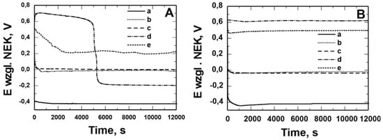 Measurement of the open potential of OCP from the time of exposure in solution: 0.5 mol dm−3 Na2SO4 pH = 2 (A) and 0.5 mol dm−3 Na2SO4 + 0.5 mol dm−3 NaCl pH = 2 (B) for X20Cr13 steel without (a) and with VTMS/PEDOT/PMo12 coatings with EDOT/PMo12 powder content: 0.1 g (b), 0.15 g (c), 0.25 g (d), 0.35 g (e).