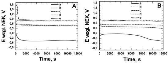 Measurement of the open potential of OCP from the time of exposure in solution: 0.5 mol dm−3 Na2SO4 pH = 2 (A) and 0.5 mol dm−3 Na2SO4 + 0.5 mol dm−3 NaCl pH = 2 (B) for 41Cr4 steel without (a) and with VTMS/PEDOT/PMo12 coatings with EDOT/PMo12 powder content: 0.1 g (b), 0.15 g (c), 0.25 g (d), 0.35 g (e).