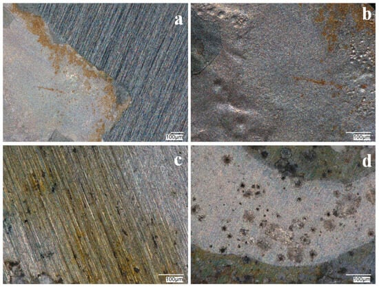 Photographs of VTMS/PEDOT/PMo12 coatings after OCP testing in a solution of 0.5 mol dm−3 Na2SO4 + 0.5 mol dm−3 NaCl pH = 2. Content of EDOT/PMo12 powder: 0.1 (a,c), 0.15 (b,d), substrate: X20Cr13 steel (a,b), 41Cr4 steel (c,d). KEYENCE VHX-7000 digital microscope, Magn. 200.