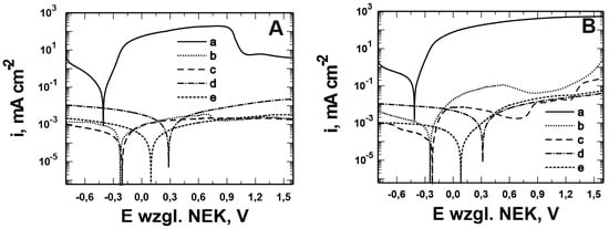 Potentiodynamic polarization curves recorded in the solution: 0.5 mol dm−3 Na2SO4 pH = 2 (A) and 0.5 mol dm−3 Na2SO4 + 0.5 mol dm−3 NaCl pH = 2 (B) for 41Cr4 steel without (a) and with VTMS/PEDOT/PMo12 coatings with powder content EDOT/PMo12 in solution: 0.1 (b), 0.15 (c), 0.25 (d), and 0.35 (e) g. Polarization rate 10 mVs−1, solutions in contact with air.