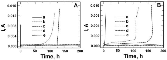 Chronoamperometric curves recorded in a solution of 0.5 mol dm−3 Na2SO4 + 0.5 mol dm−3 NaCl pH = 2 for steel: X20Cr13 (A) and 41Cr4 (B) without (a) and with VTMS/PEDOT/PMo12 coatings with EDOT/PMo12 powder content: 0.1 (b), 0.15 (c), 0.25 (d), and 0.35 (e) g.