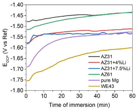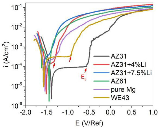 The evaluation of the open circuit potential (EOCP) of the investigated materials during 1 h of immersion in 0.1 M NaCl is presented in Figure 1. The highest values of the EOCP were observed for AZ31 and AZ61, and their average values were −1.45 V/Ref and −1.46 V/Ref, respectively. The 4 and 7.5 wt.% of Li addition shifted the EOCP toward negative values: −1.53 V/Ref and −1.54 V/Ref, respectively. The lowest values of EOCP were observed for pure Mg and WE43: −1.56 V/Ref and −1.65 V/Ref, respectively. Inspection of the anodic branch of the polarization curves in Figure 2 determined the active dissolution of the AZ61, while the rest of the alloys underwent localized corrosion. A characteristic plateau was observed on the anodic branch of AZ31, WE43, pure Mg, AZ31+4Li, and AZ31+7.5Li, and a typical inflection point indicating the breakdown potential, Eb, was also noted (labeled by the red arrows in Figure 2). The difference between Eb and Ecorr describes the resistivity to pitting corrosion, ∆E [30,31]; the broader the difference, the higher the resistance to pitting. The numerical values of the resistivity to pitting are shown in Table 2. Undoubtedly, the highest pitting susceptibilities were in the cases of pure Mg and the alloys with Li addition. The most stable corrosion layers were formed on the AZ31 and WE43.