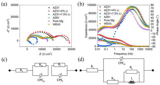 Electrochemical impedance spectroscopy (EIS) results recorded after 1 h of immersion in naturally aerated 0.1 M NaCl and presented in the form of (a) Nyquist plots, (b) Bode plots, (c) equivalent electrical circuit used for pure Mg, AZ31, AZ61, AZ31+4Li, and WE43 fitting, and (d) equivalent electrical circuit used for AZ31+7.5Li fitting.