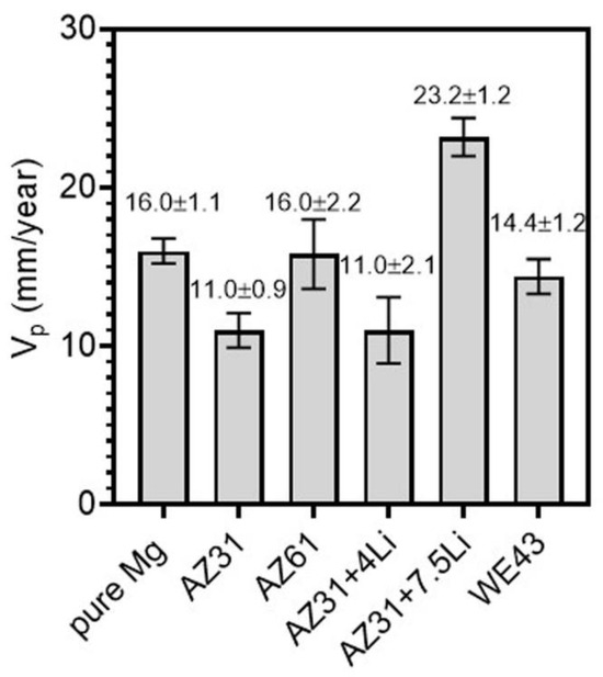 As per results of this work, lower corrosion rate estimated via electrochemical measurements was observed for α(Mg) alloys than for dual-structured α(Mg)+β(Li) alloys. The most resistant in the analyzed medium was AZ31. As shown in [21], it has a grain size of 4.38 µm and a preferential orientation of the grain toward (10) and (2110). The Al fully dissolved in the solution, and no β-Mg17Al12 was formed. Similar level of corrosion resistance was observed for the AZ31 alloyed with 4 wt.% of Li. In this case, nanosized β-Mg17Al12 distributed in the grain interiors was observed, creating a barrier against spreading corrosion reactions caused by the Li in the alloy [23]. Lower corrosion resistance and also corrosion products being formed on the surface in some kind of “protective” layer, was characteristic for WE43, pure Mg, and AZ61. The presence of nanosized β-Mg17Al12 at the grain boundaries promotes microgalvanic corrosion in AZ61, thus lowering its corrosion resistance when compared to AZ31 [22]. Surprisingly, pure Mg had a higher corrosion rate than AZ31. Since the grain sizes for pure Mg and AZ31 were similar, the factor favoring higher corrosion resistance lay in the crystallographic orientation of the grains formed in AZ31. In this case, besides grains oriented to (10) and (2110), grains with a (0001) orientation were present. In this relation, the grains with an (0001) orientation parallel to the corroded surface are more corrosion resistant than grains with orientations (10) and (2110) [37].