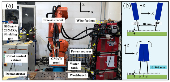 Figure 1. (a) Double-wire narrow-gap GMAW system and (b) arrangement of the double wire.
