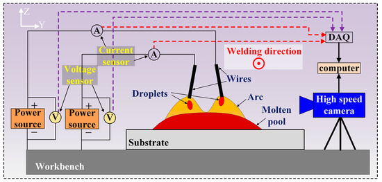 In order to obtain suitable process parameters for narrow-gap welding, welding was first conducted on the Q235 substrate with a thickness of 10 mm to study the arc shape, droplet transition mode, and current–voltage waveforms. Firstly, welding experiments were conducted on a flat plate through single-wire welding using the parameters shown in Table 2, and the welding voltage was automatically matched with that of the welding power source. Then, double-wire welding was conducted using the optimized wire feeding speed. As shown in Figure 2, a high-speed camera (OLYMPUS I-SPEED, Shanghai, China) was used to capture the behavior of the arc and droplet transfer during the welding process. The camera was placed perpendicularly to the welding direction, and the camera frame rate and exposure time were 2000 fps and 2 μs, respectively. Simultaneously, an electrical signal acquisition device was used to collect the current–voltage waveforms of the arc during welding. The electrical signal data of two arcs were collected simultaneously, with a sampling frequency of 1000 Hz. The information collected during the welding process was processed and analyzed to study the stability of the welding process and the interaction behavior between the double arcs.