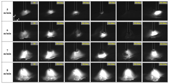 Figure 4. Arc and droplet behaviors under different wire feeding speeds (5 m/min, 6 m/min, 7 m/min, and 8 m/min) from side view.