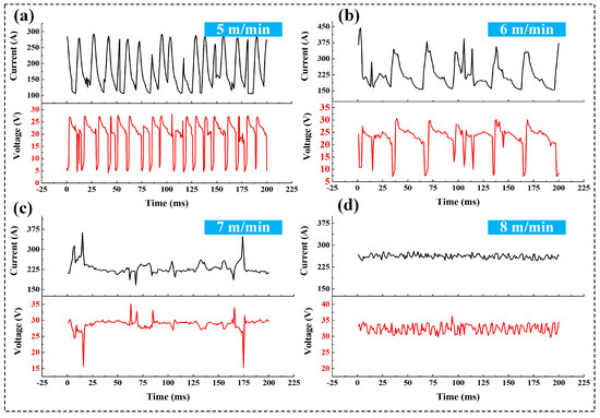 Figure 5. Current–voltage waveforms under different wire feeding speeds: (a) 5 m/min; (b) 6 m/min; (c) 7 m/min; (d) 8 m/min.