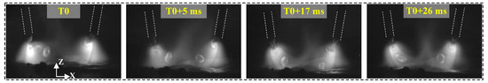 Figure 6. The behaviors of double-wire arcs and droplets at a wire feeding speed of 8 m/min from side view.