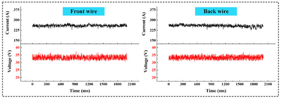 In the double-wire welding process, the interference between the two arcs is the main factor affecting the stability of the welding process [28]. However, in this study, no impact on welding stability was observed, as evidenced by the current–voltage waveforms shown in Figure 7. The stability of the double-wire welding process may be attributed to the self-regulating function of the welding power source.