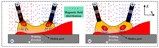It is worth noting that during the double-wire welding process, the two arcs attract each other, resulting in a noticeable arc deflection. Additionally, the droplets exhibit a movement toward the center between the two arcs. This is the result of the interaction of magnetic fields produced by the two wires. During welding, the welding power sources are connected in a circuit with the wires and the workbench, with the current flowing from the wires through the arc to the workbench. Figure 8 illustrates the behavior of the arcs and droplets in the magnetic field during the double-wire welding process. The red and blue symbols in the figure represent the magnetic field distribution of the front and back wires, respectively. Additionally, the cross marks symbolize the direction perpendicular to the page inward, and the dot marks symbolize the direction perpendicular to the page outward. The plasma is ultimately deflected due to the action of the Lorentz force. The droplets detached from the end of the wires under the action of the electromagnetic pinch force (Fem), plasma flow force (Fd), gravity (G), frictional force (Ff), surface tension (Fγ), metal vapor recoil force (FJ), and Lorentz force (FL) [32,33]. As the resultant force on the droplets does not align with the axis of the welding wire, the droplets ultimately transition toward the center of the molten pool.