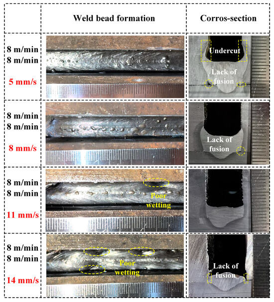Figure 9. Weld bead formation and cross-section under different welding speeds (5 mm/s, 8 mm/s, 11 mm/s, and 14 mm/s) at a wire feeding speed of 8 m/min for the double wires.